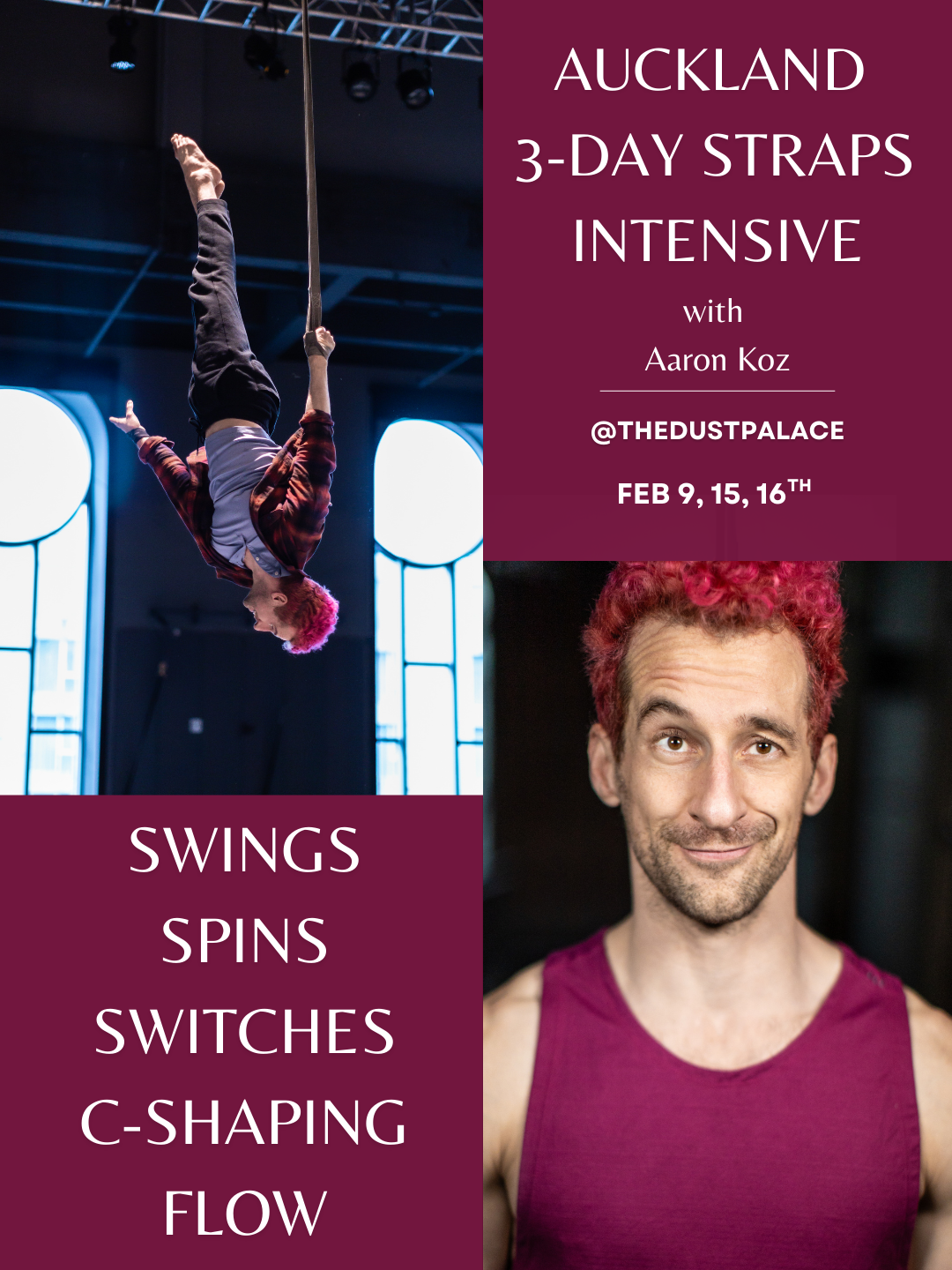 Join Aaron Koz for a 3-day aerial straps workshop series to level up your fundamental to advanced straps theory, strength, and skill for swinging, spinning, and c-shaping movements. Multiple progressions will be provided to cover all levels, whether student, coach, or performer.